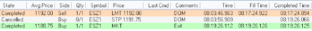 The larger rectangle shows the same area of interest as on the 30 minute chart. The smaller, blue shaded, rectangle shows a micro-acceptance zone. From that zone, we can see the exact origin of the move down. That's exactly where the imbalance occurred. And, exactly where we'd want to take a trade from. Here's what the trade result looked like...